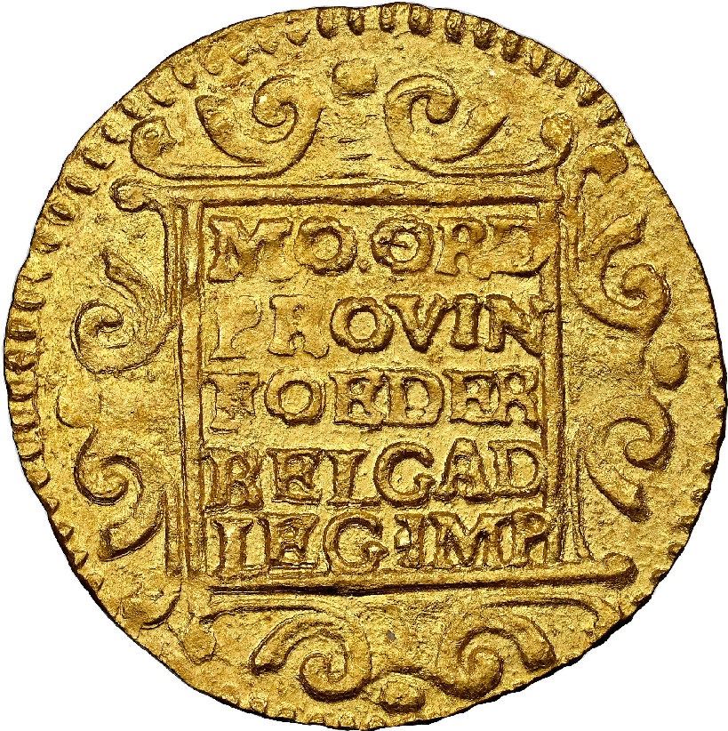 Utrecht, United Netherlands, gold ducat, 1724, NGC MS 63 / Akerendam (Shipwreck Blue Label). KM-7.1; Fr-285. Nice luster on satin smooth fields except for tiny marks to right of knight's head, which is slightly weak, the rest of the strike full. Recovered from: Akerendam, sunk in 1725 off Norway