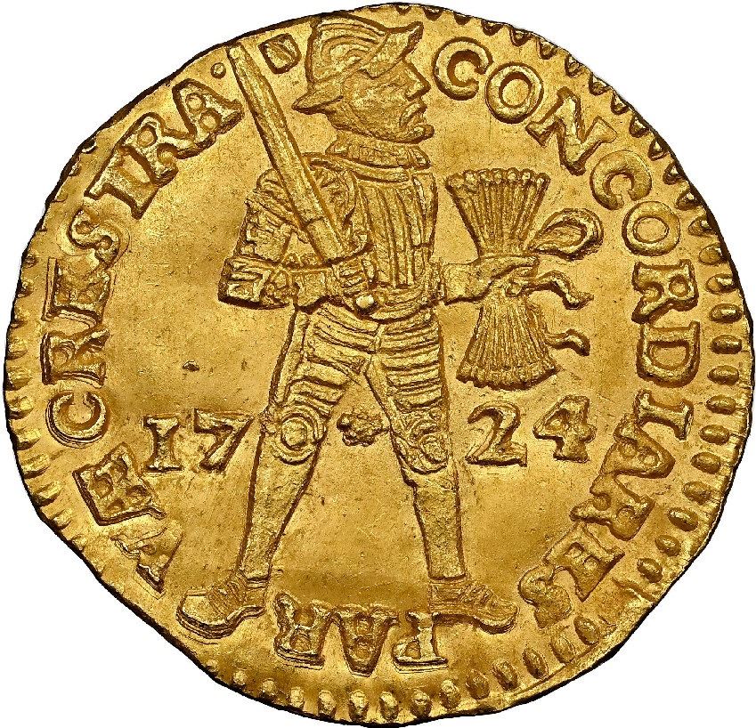Utrecht, United Netherlands, gold ducat, 1724, NGC MS 64 / Akerendam (Shipwreck Blue Label). KM-7.1; Fr-285. Good luster over smooth surfaces, strong strike all over (including knight's head). Recovered from: Akerendam, sunk in 1725 off Norway