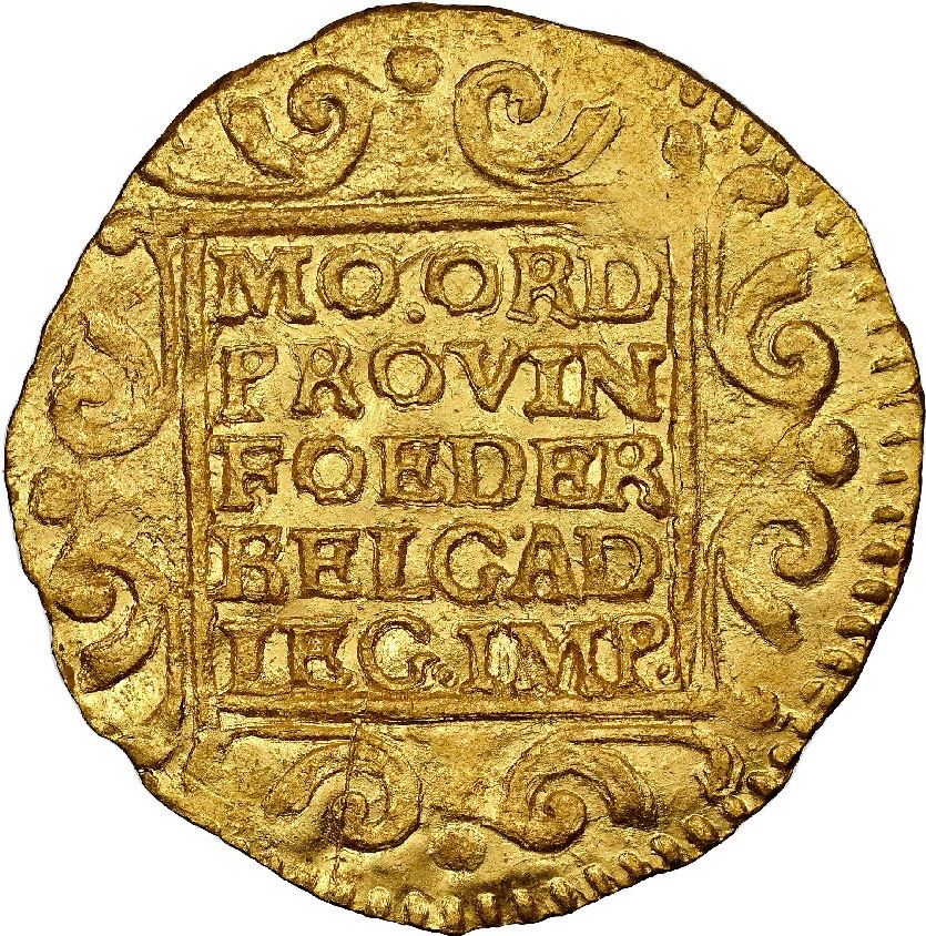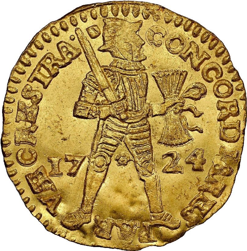 Utrecht, United Netherlands, gold ducat, 1724, NGC MS 64 / Akerendam (Shipwreck Blue Label). KM-7.1; Fr-285. Strong luster and smooth fields except for a bumpy area between the knight's legs, also his head weak but the rest of the strike full. Recovered from: Akerendam, sunk in 1725 off Norway