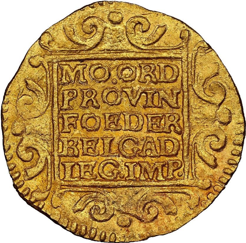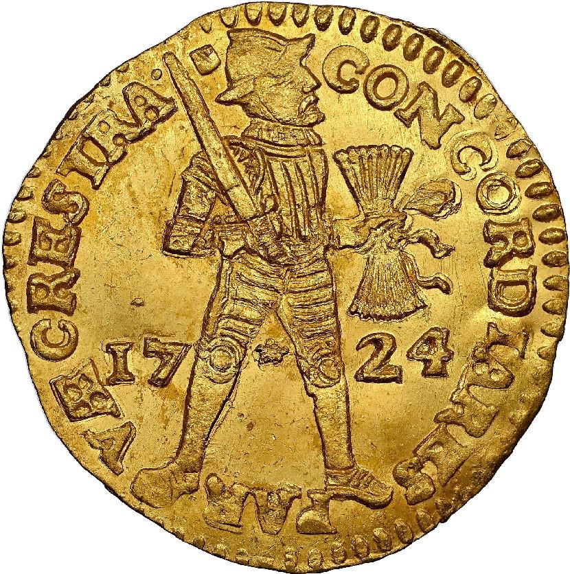 Utrecht, United Netherlands, gold ducat, 1724, NGC MS 65 / Akerendam (Shipwreck Blue Label). KM-7.1; Fr-285. Choice strike, the knight's head almost fully detailed, nice luster and satin fields, tied for second highest grade behind a single MS 66 at NGC. Recovered from: Akerendam, sunk in 1725 off Norway