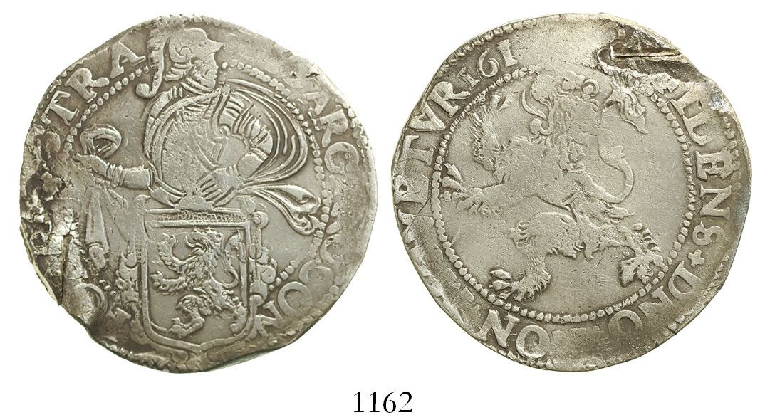 Utrecht, United Netherlands, "lion" daalder, 1617. KM-13. 26.83 grams. Parts of legend bold (clear 161 but weak 7 of date), full but slightly weak lion and knight, no corrosion but part of edge mangled, nicely toned. With salvagers' certificate #RD19. Recovered from: Campen, sunk in 1627 off the Isle of Wight, south of England