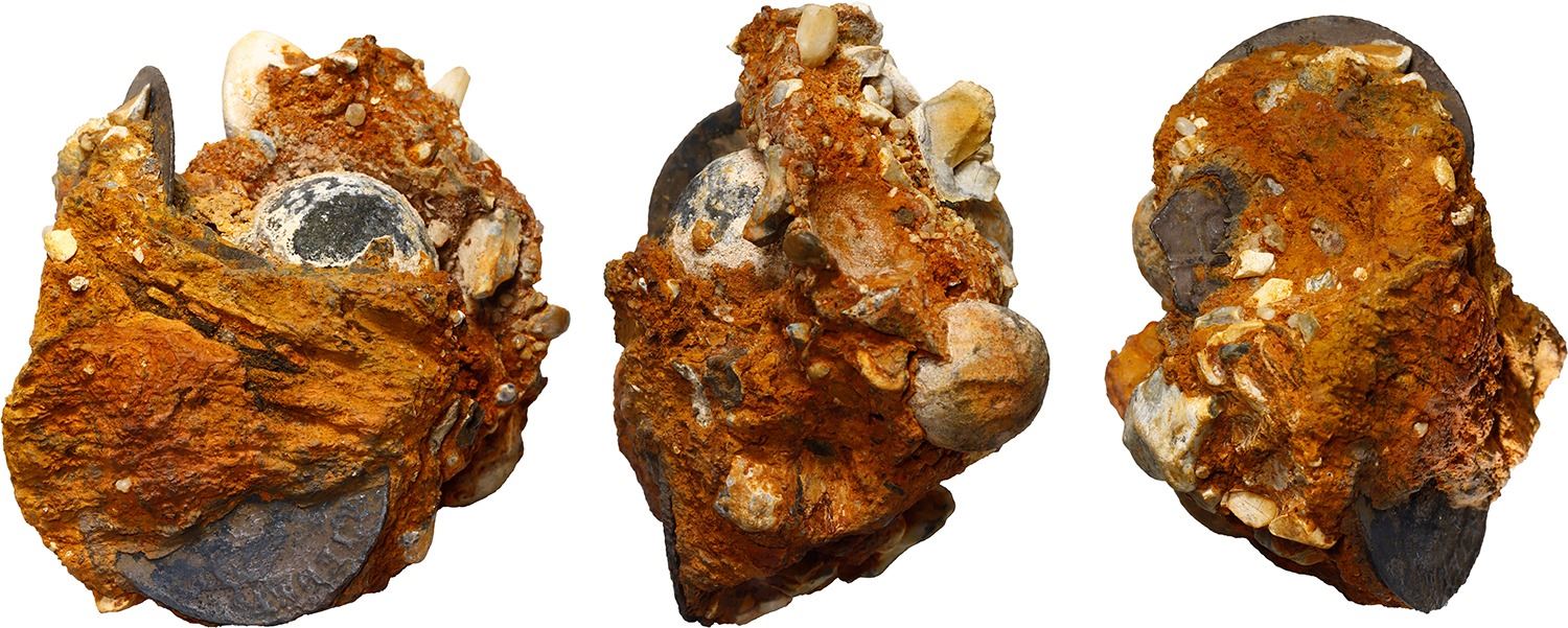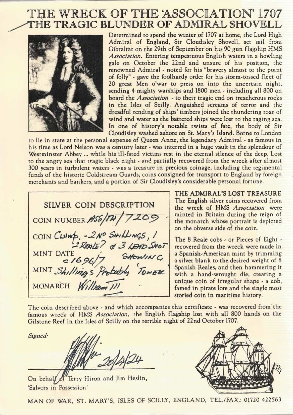 VARIOUS COUNTRIES, clump of one Mexican cob and two English shillings plus three lead musketballs. 153 grams total. Roughly 2" x 1¾" x 1¼". Very neat and hefty clump with rust-orange encrustation binding together two English shillings plus a Mexican cob ½ real along with several lead musketballs, quite rare from this wreck. With photo-certificate ASS/TH/7209 from the salvor. Recovered from: Association, sunk in 1707 off the Isles of Scilly, south west of England