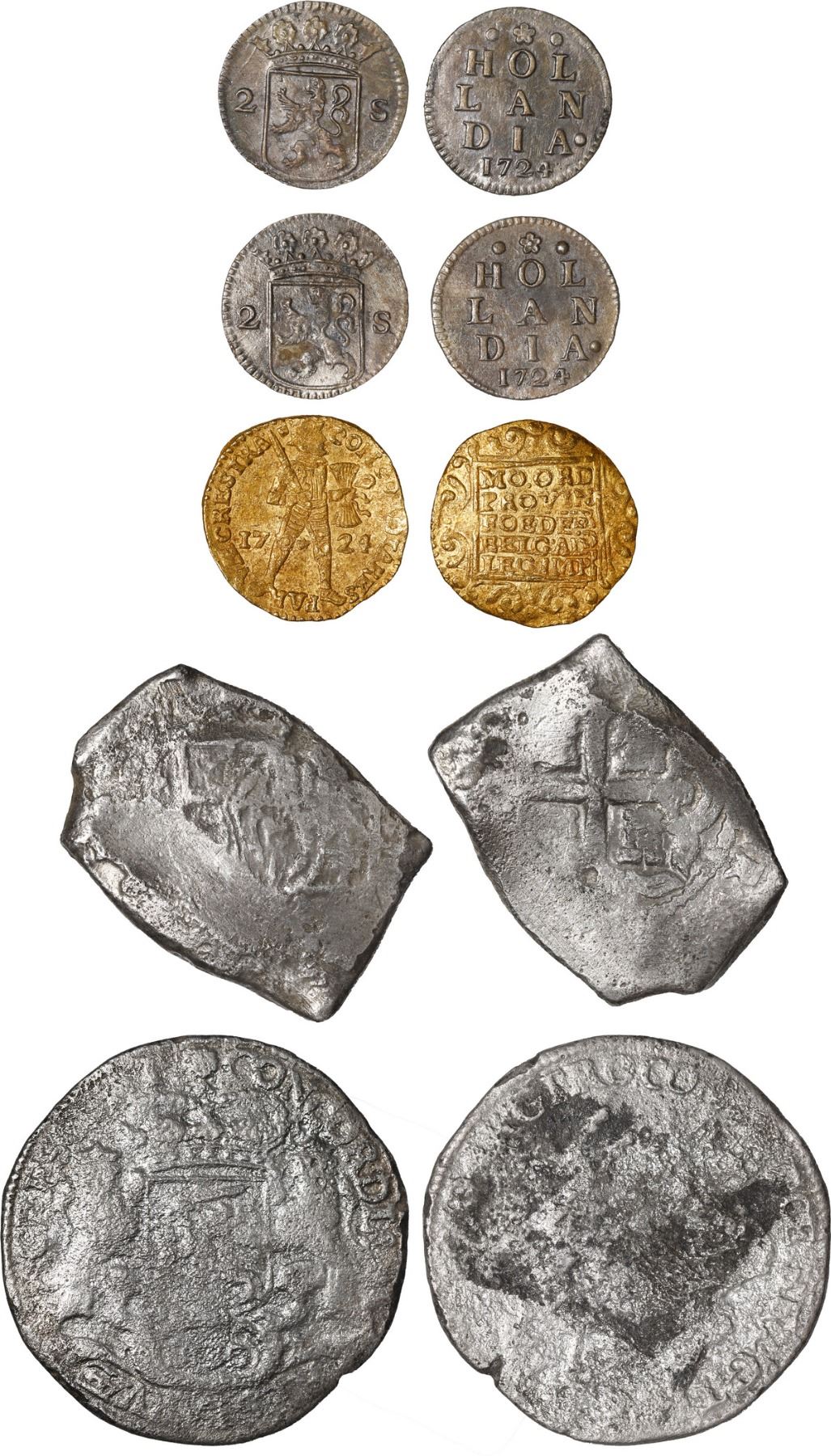VARIOUS COUNTRIES, five-coin set in Abafil case consisting of one Dutch gold ducat, one Mexican cob 8 reales, one Dutch ducatoon, and two Dutch 2 stuivers. Neatly put-together set with a 1724-dated Utrecht gold ducat showing matte surfaces from light corrosion along with a corroded Dutch ducatoon and Mexican cob 8 reales plus two rather nice Dutch 2 stuivers, not to be confused with an original promotional set, but similar. Recovered from: Akerendam, sunk in 1725 off Norway