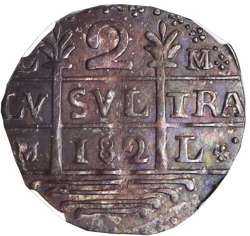 VENEZUELA, Caracas, "imitation cob" 2 reales, "182" date (early 1800s), quadrants of cross transposed, NGC AU 58. Cal-745; KM-C13.1. Very deeply rainbow toned with choice full inner details plus much of the rarely seen "legend" of quatrefoils on both sides, near top grade (within the top 10% at NGC).