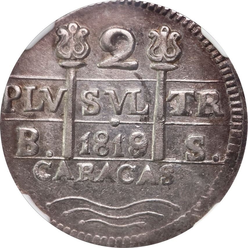 VENEZUELA, Caracas, "imitation cob" 2 reales, Ferdinand VII, 1819/8 BS, castles and lions in proper quadrants, NGC AU 50. KM-unl (C6.2 for type); Cal-736. Lustrous and lightly toned, slightly off-center strike with some weakness on rims, some faint hairlines, bold overdate as usual.