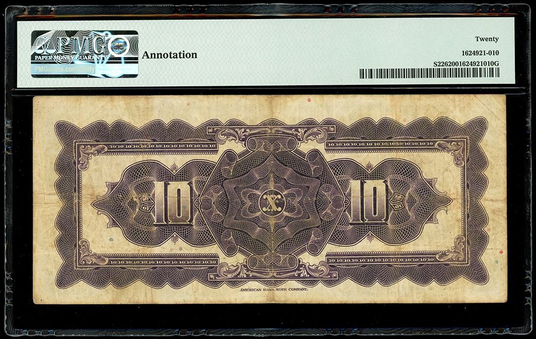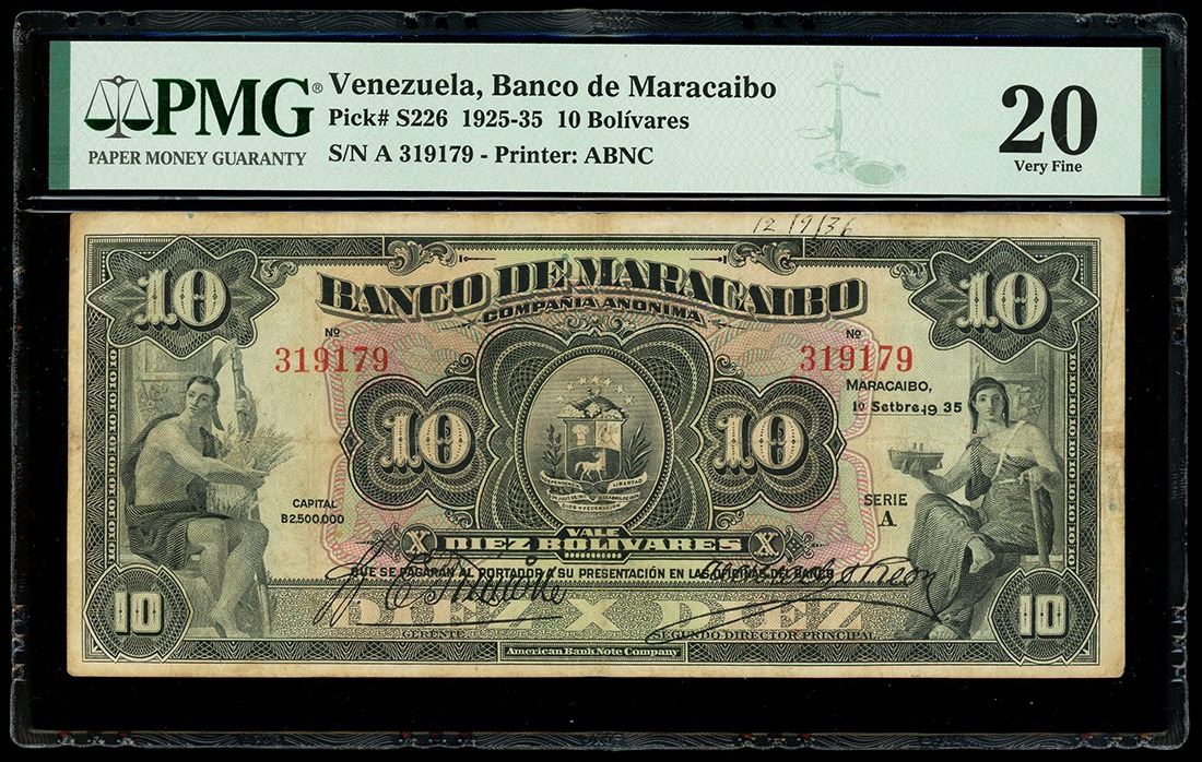 VENEZUELA, Maracaibo, Banco de Maracaibo, 10 bolívares, 10-9-1935, series A, serial 319179, PMG VF 20. Pick-S226. Popular type with a striking design. Circulated yet bold example with strong signatures and date, penned annotation in top margin as noted on the PMG label. Please use this link to verify the certification number