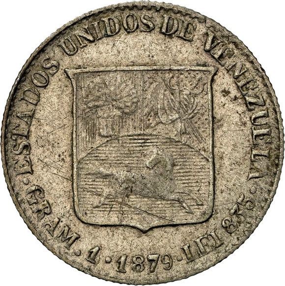 VENEZUELA, struck in Belgium, 1/5 bolívar, 1879, crude letters, NGC AU details / scratches.