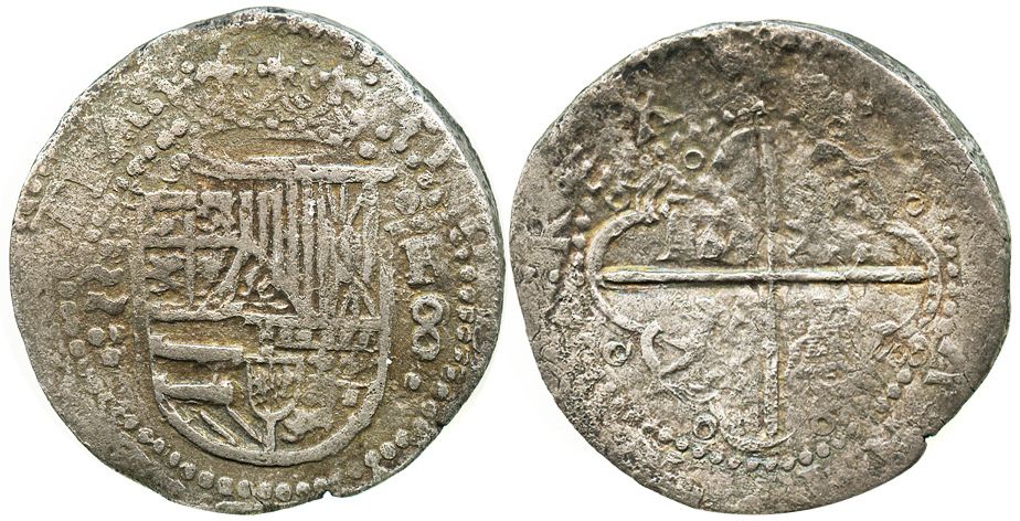 Valladolid, Spain, cob 8 reales, Philip II, assayer F (1590), very rare. CT-281. 24.5 grams. Broad, round flan with well-detailed full shield flanked by 3-wave mintmark to left (above which should be the two-digit date 90, but it is doubled there) and assayer F above denomination 8 to right, full crown and much legend, the cross full too but somewhat indistinct due to surface corrosion, otherwise AVF and lightly toned. Note the CT value for this one-year issue is 3000 Euros!