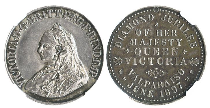 Valparaiso, Chile, silver 1/2 peso-sized medal, 1897, Queen Victoria diamond jubilee, ex-Tarapaca, encapsulated NGC AU 58. 29mm. Obverse with bust of Victoria, name in title in legend, GM and LIMA on truncation; reverse with DIAMOND JUBILEE above OF HER MAJESTY QUEEN VICTORIA and VALPARAISO / JUNE 1897. Beautifully rainbow-toned. Pedigreed to the Tarapaca collection, as stated in the slab.