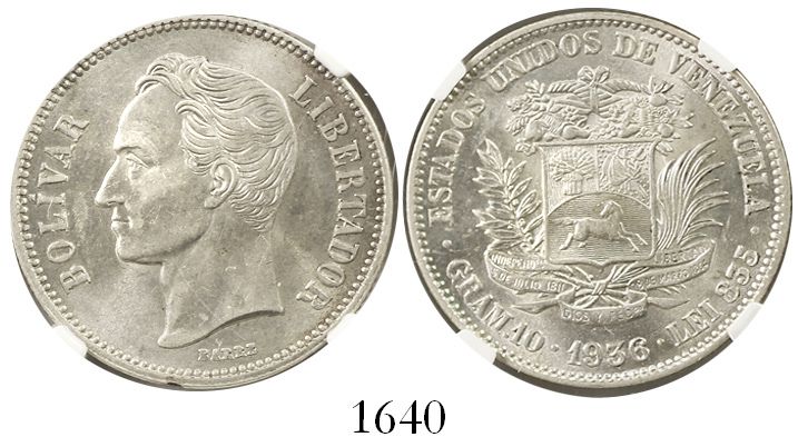 Venezuela, (2 bolivares), 1936, encapsulated NGC AU 58. KM-Y23 Strong luster (begs a higher grade) and incipient toning, no bagmarks.