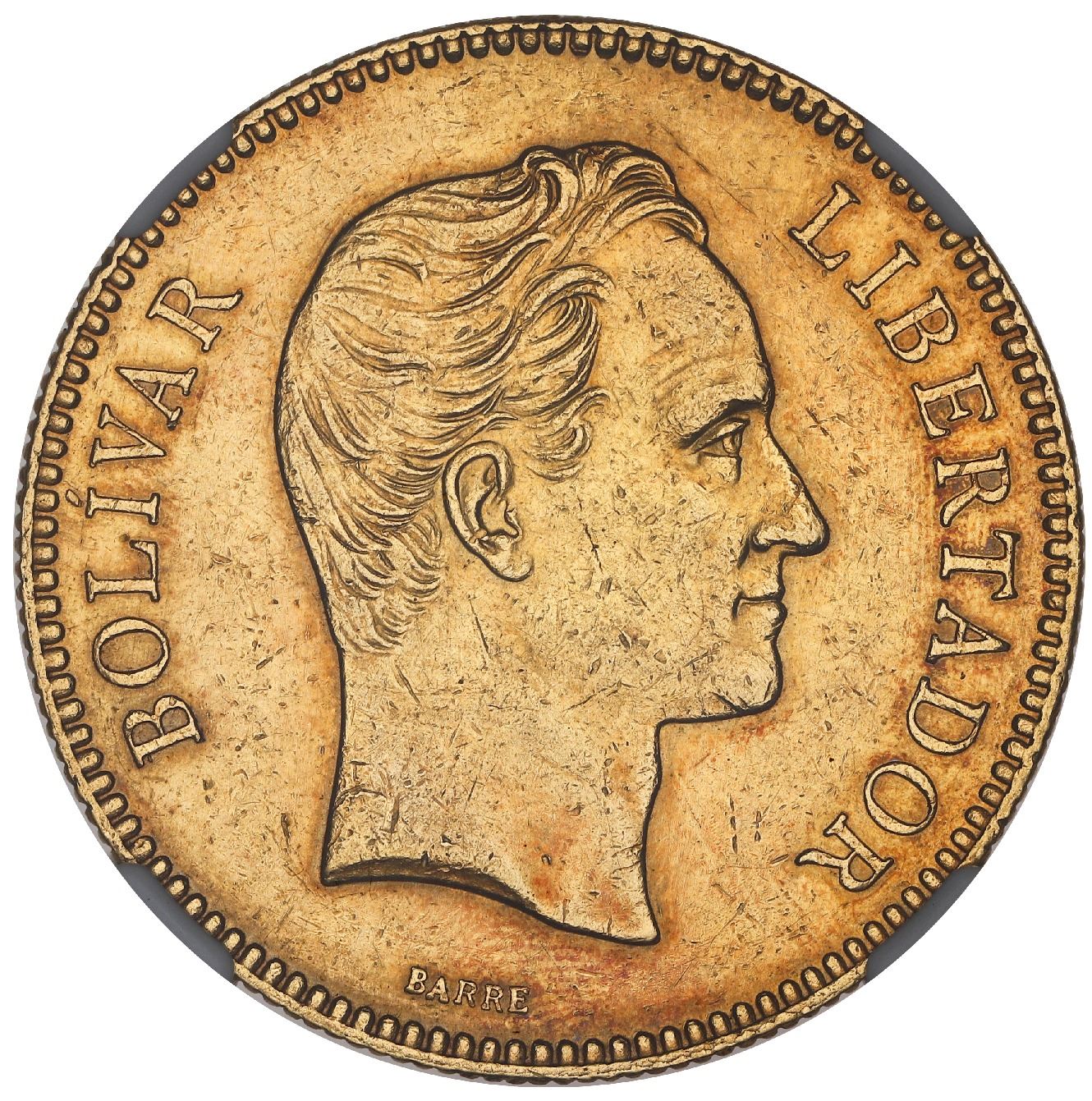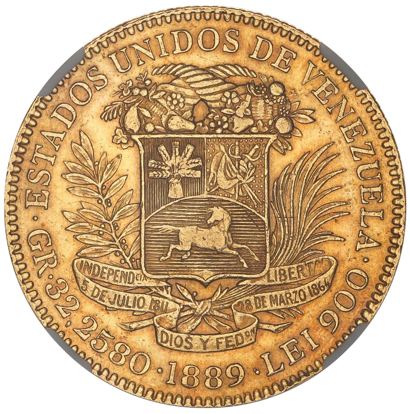 Venezuela, gold 100 bolivares, 1889, NGC AU 55.