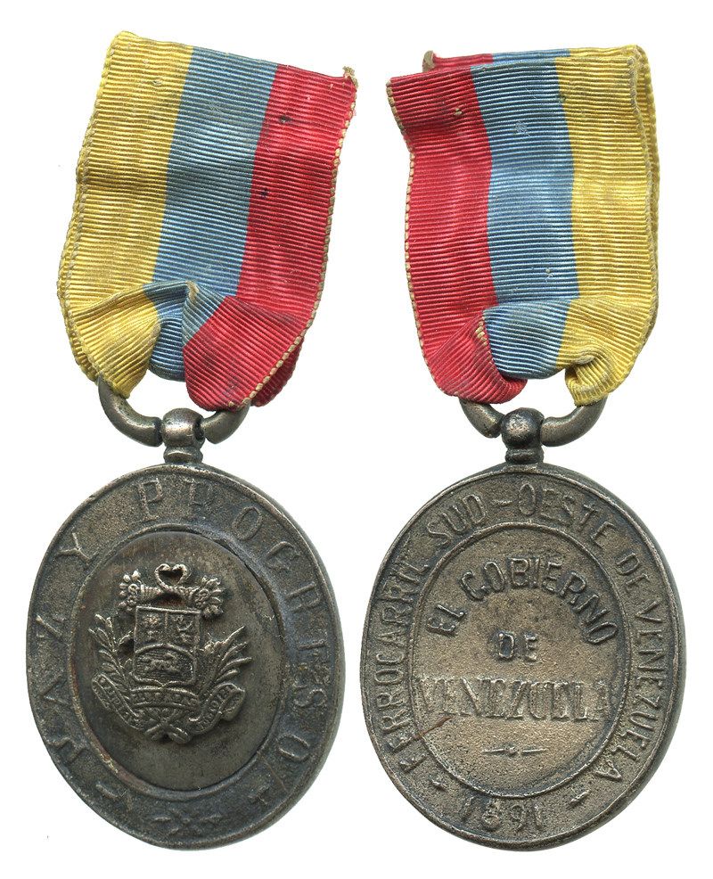 Venezuela, heavy base-metal railroad medal (oval), visible date 1891, with ribbon. 32.0 grams. (cast metal) Oval medal with arms in high relief on obverse, date at bottom of reverse, toned. AS IS
