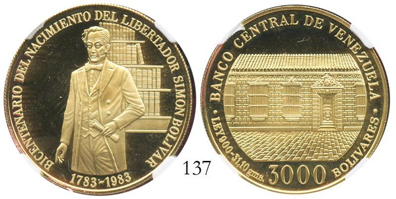 Venezuela, proof 3000 Bolivares, 1983, Bolivar Bicentennial, encapsulated NGC PF-68 Ultra Cameo. KM-Y59. Near perfect proof, slightly rose-colored.