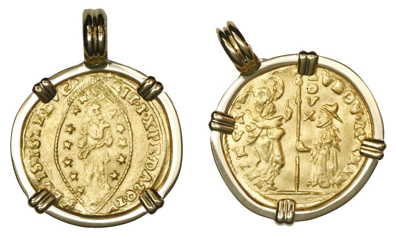 Venice (Italian States), gold zecchino, Ludovico Manin (1789-97), mounted Christ-side out in 18K bezel. 7.45 grams total. Fully detailed AU- (features slightly crude), well presented in a sturdy mounting.