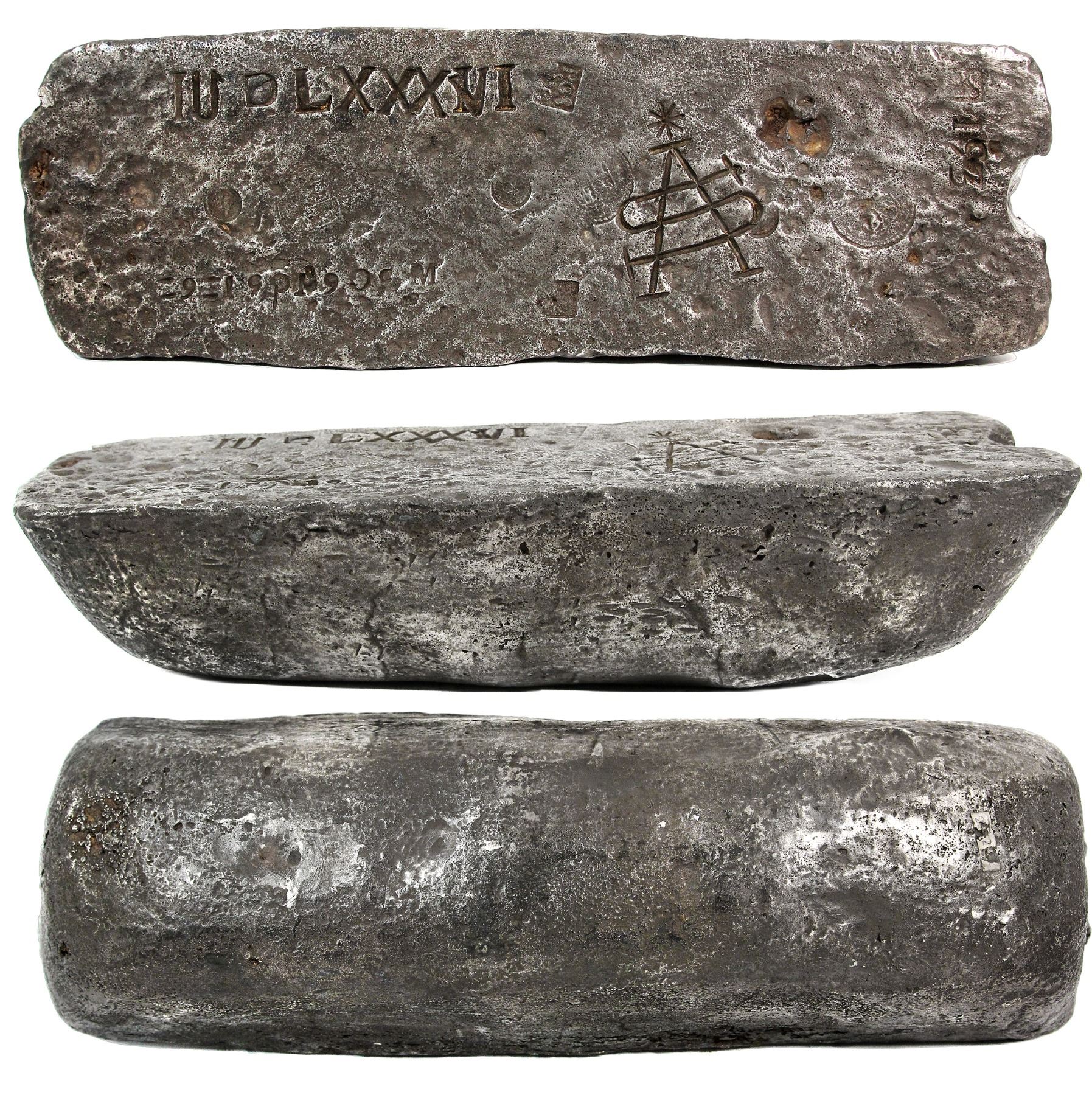 Very large silver bar made in Oruro, 92 troy lb, 91% fine, marked with value 9 15 P 1905 M (pesos and maravedis), date 1652, weight 153 (marcos), manifest number IUDLXXXVI (1586), assayer PRGoS / LENoARG(?), tax stamps and owner/shipper marks, ex-Maravillas (1656), ex-Trabucco. 16-1/4" x 5-1/4" x 3-1/2". This massive ingot is a lesson in cryptography, as it is loaded with mysterious markings and cartouches that defy attribution on their own but amazingly match those on a very similar bar found on the "Jupiter Wreck" (1659) and illustrated and described on pages 116-119 of Spanish Treasure Bars (Craig and Richards, 2003). These markings include a date cartouche with ANO above 1652, an unidentified PLoS cartouche, and a two-line assayer cartouche containing several monogrammed letters. In addition, this bar bears an owner/shipper mark of star-topped AS monogram (name unknown) that matches bars from the Capitana (1654) and an unidentified wreck salvaged off Gorda Cay by Art McKee in 1949 that must have been a salvage vessel carrying bars recovered from the Maravillas. The attribution to Oruro is based on a large cylindrical bite (large) in one side, next to a marking of weight given in marcos (153), which when combined with the pesos and maravedis value of 9 15 P 1905 M (with double-line ornament before the 9 and triple-line ornament before the 15) should equate to a fineness of 2188 / 2400 (not marked on bars of this transitional period), as XRF testing shows 91.15% silver. There are also at least three large, circular tax stamps (just like what we see on 1622-Fleet ingots) in addition to at least two, smaller, circular crown-alone stamps like those hammered onto Potosi coins of 1649-52. With minimal surface corrosion, elegant toning, and neat orange encrustation in crevices, this is a premium bar all around, one of very few recovered from this wreck. From the Maravillas (1656), with original MAREX photo-certificate hand-signed by Herbert Humphreys, Jr, also pedigreed to the Trabucco (Atlantic City) auction of January 1993.