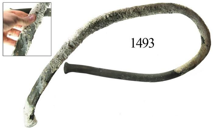 Very long section of a large, bronze rudder-pin, coral-encrusted and bent into an oval shape.