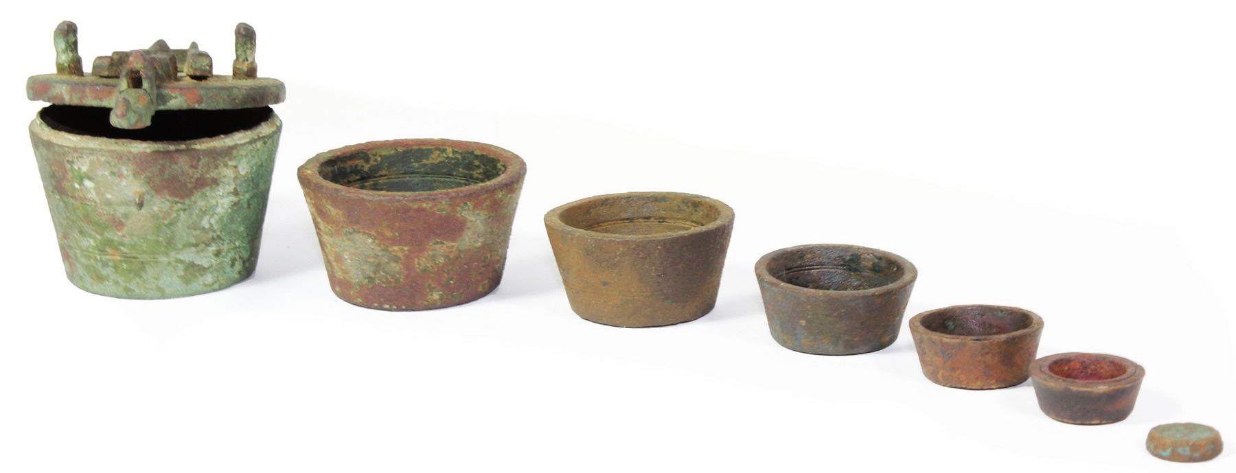 Very rare complete set of bronze nested weights with lid and case, Spanish colonial (1500s-1600s). 424 grams, 2" tall. A complete and well-matched set from at least two different makers, whose marks are visible on some of the weights.