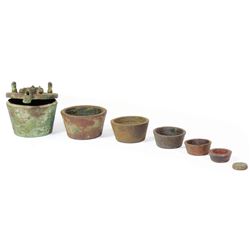 Very rare complete set of bronze nested weights with lid and case, Spanish colonial (1500s-1600s).