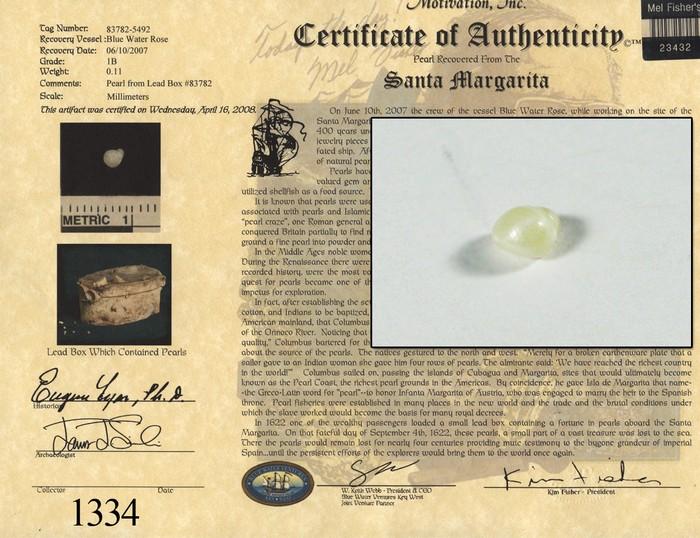 Very small natural pearl. 0.11 carat, 2.5 mm. White and spherical but with a small protrusion that is slightly darker. Recovered from: Santa Margarita, sunk in 1622 west of Key West, Florida. With Fisher photo-certificate #5492.