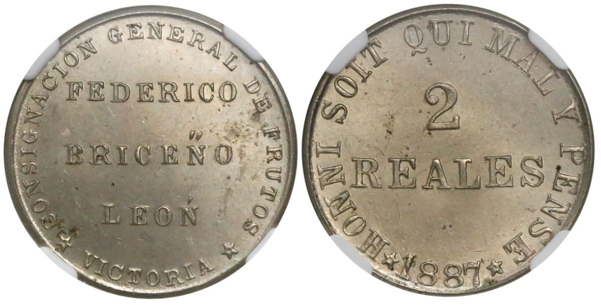 Victoria (Aragua), Venezuela, copper-nickel 2 reales token, 1887, Federico Briceno Leon, encapsulated NGC MS 62, finest and only known specimen in NGC census. Stohr-FL44. 24mm; 5.27 grams. Obverse: Consignacion general de frutos, Victoria, Federico Briceno Leon. Reverse: Honni Soit Qui Mal y Pense, 1887. Light toning and minor marks in fields, NGC certification number 4431158-009.