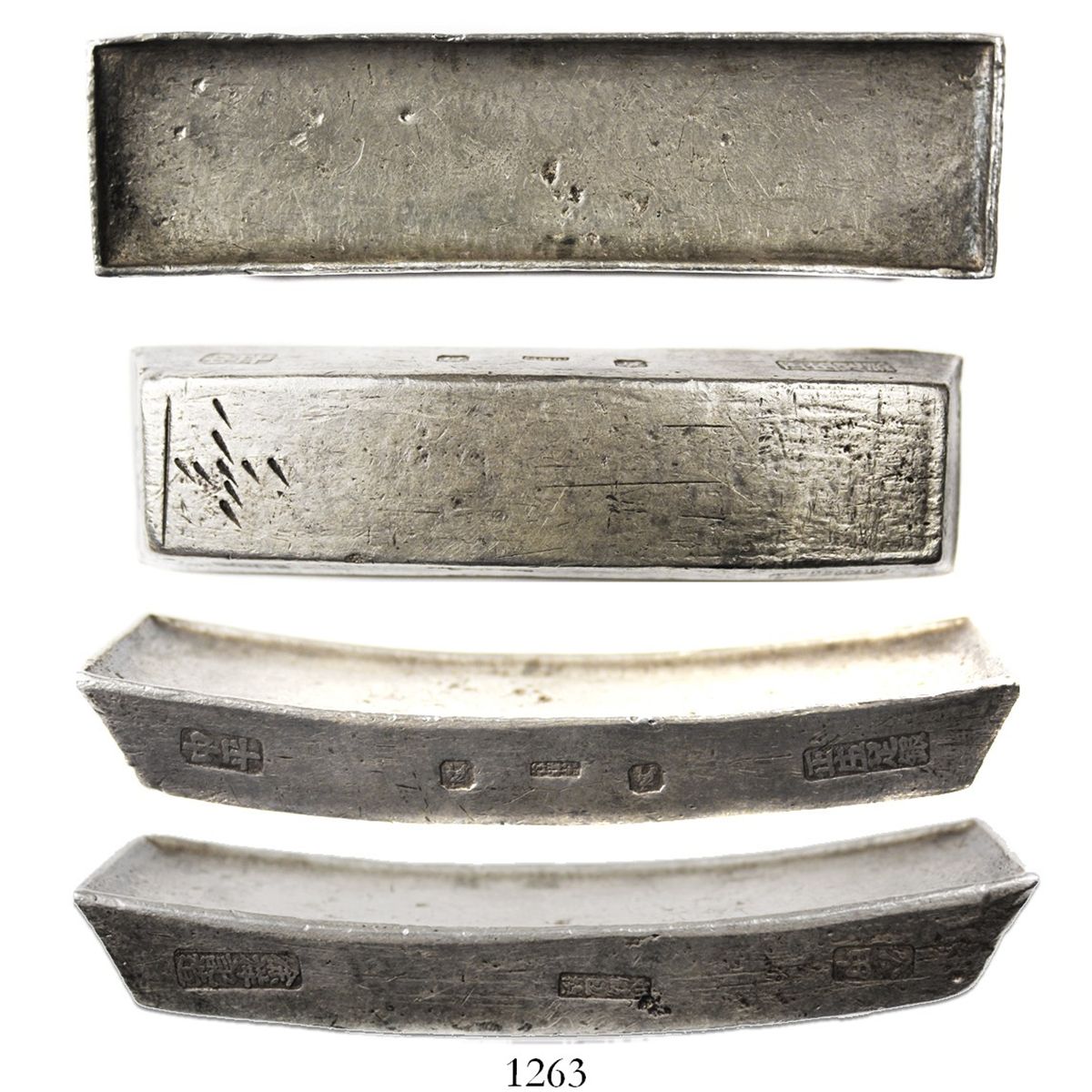 Vietnam, Minh Mang 10-lang sycee silver bar, mid-1800s. 375.0 grams, 4-1/4" long. Sometimes called "nén bac," stackable trough-shaped ingots like these are a distinctly Vietnamese type of semi-official sycee cast mainly from Spanish American 8 reales, Indian rupees, and French Indochina piastres by bankers (silver merchants) who presented them to government officials for testing, whereupon a fee was paid and the denomination thap (10) lang and three other "verification stamps" were stamped onto the sides of the ingot. This specimen appears to be no worse than AVF, with clear test-marks on bottom.