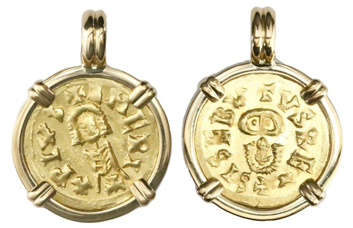 Visigoths (Spain), AV tremissis, Sisebut (612-621 AD), Emerita mint (Merida, Badajoz), mounted in 18K gold bezel. 5.11 grams total. +SISEBVTVS REX, facing bust / +EMERI-T-L PIVS, facing bust. Lustrous AU+, bold details.