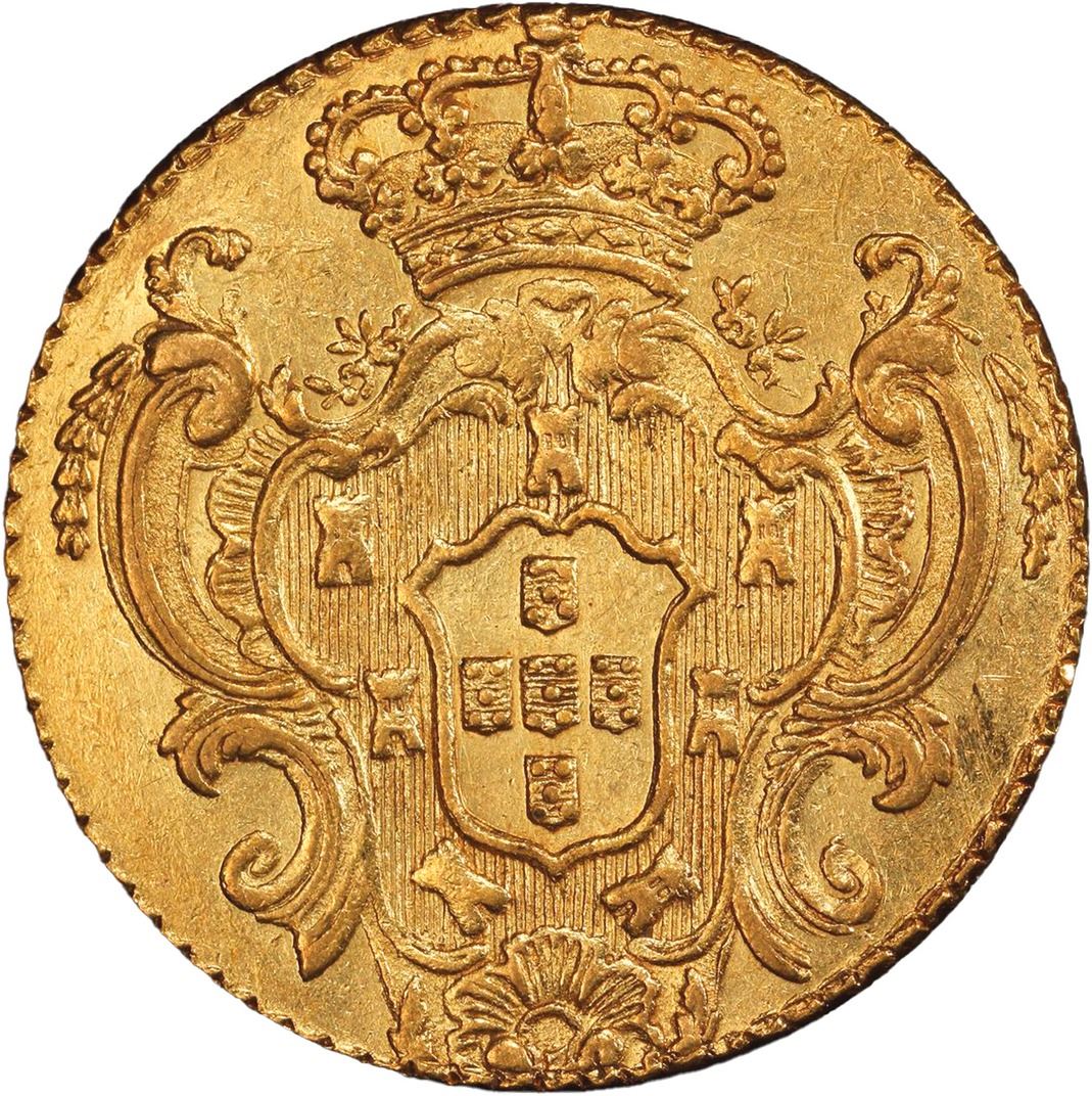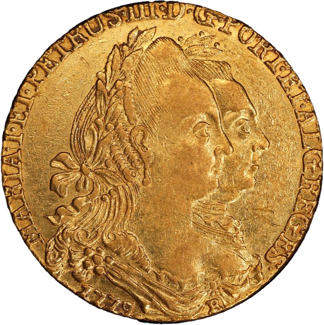 WEST INDIES, gold contemporary imitation ("Joe") of a Rio, Brazil, 6400 reis, Maria I and Pedro III, 1779-R, PCGS AU53. Gordon-p. 40. Lustrous and only lightly marked and hairlined, slightly truncated peripheral details (date, legend) due to clipping and re-edging (weight not stated on label).