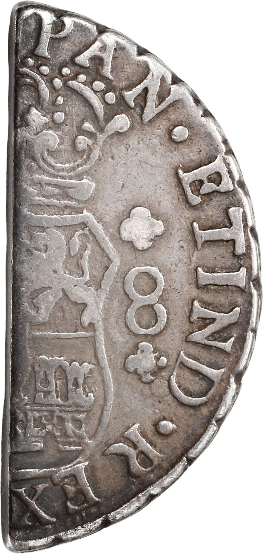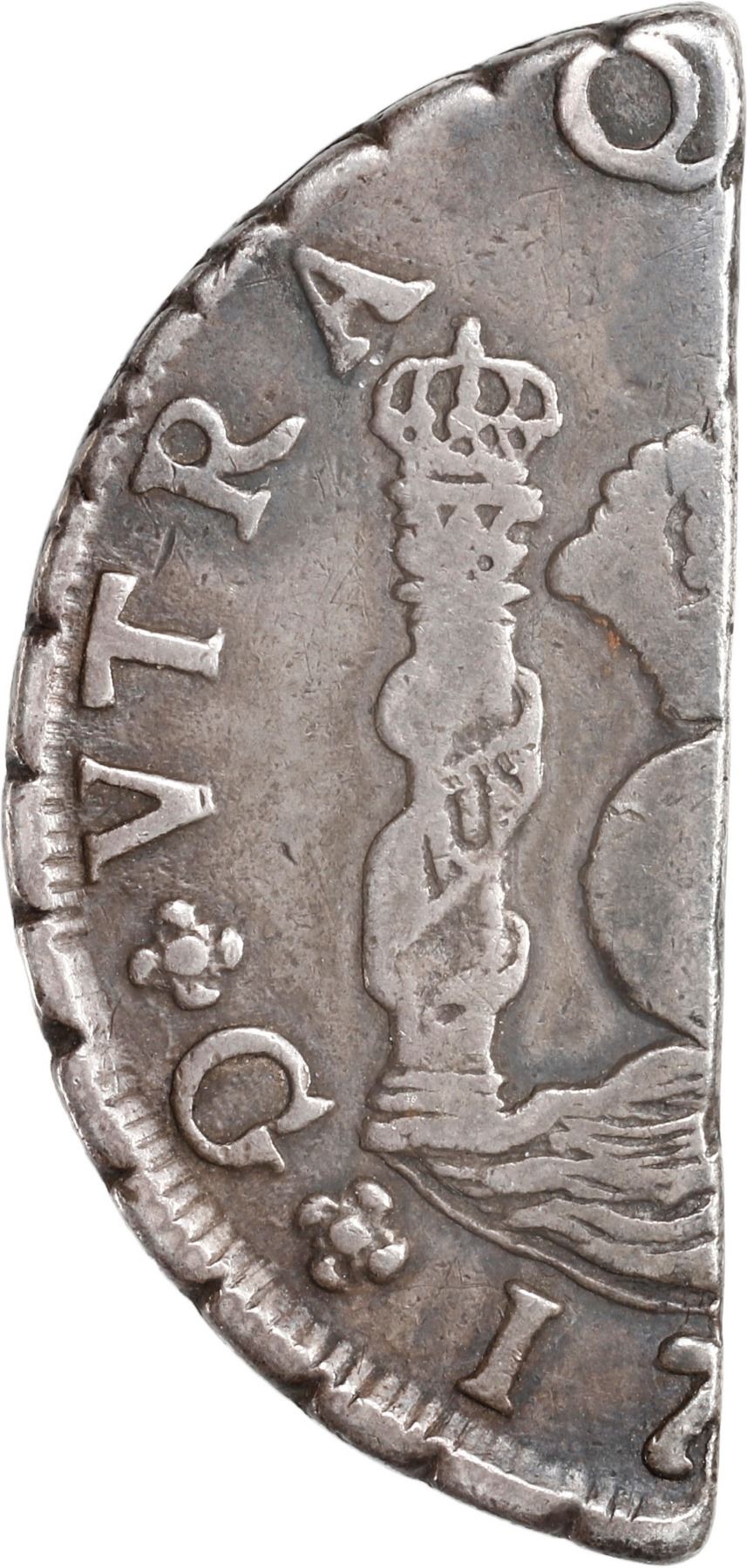 WEST INDIES, half cut of a Guatemala City, Guatemala, pillar 8 reales, Ferdinand VI or Charles III, rare. Prid-1 under Barbados. 11.44 grams. While official cut and countermarked issues from the various West Indies islands like Tortola are well cataloged, there are original cut coins without countermarks that cannot be fully attributed, like the present piece, whose cut edge is correct for the period and bears deep toning and circulation wear like the rest of the coin (VF). As Pridmore points out, the island of Barbados was known to have half-cuts of pillar dollars without countermarks, but we cannot rule out the same for other islands on an unofficial basis. In any case, the weight of this piece is a couple grams below half of an 8 reales, so whoever cut it was taking a little bit off for himself.