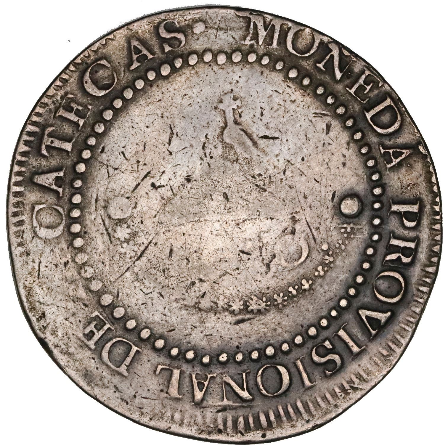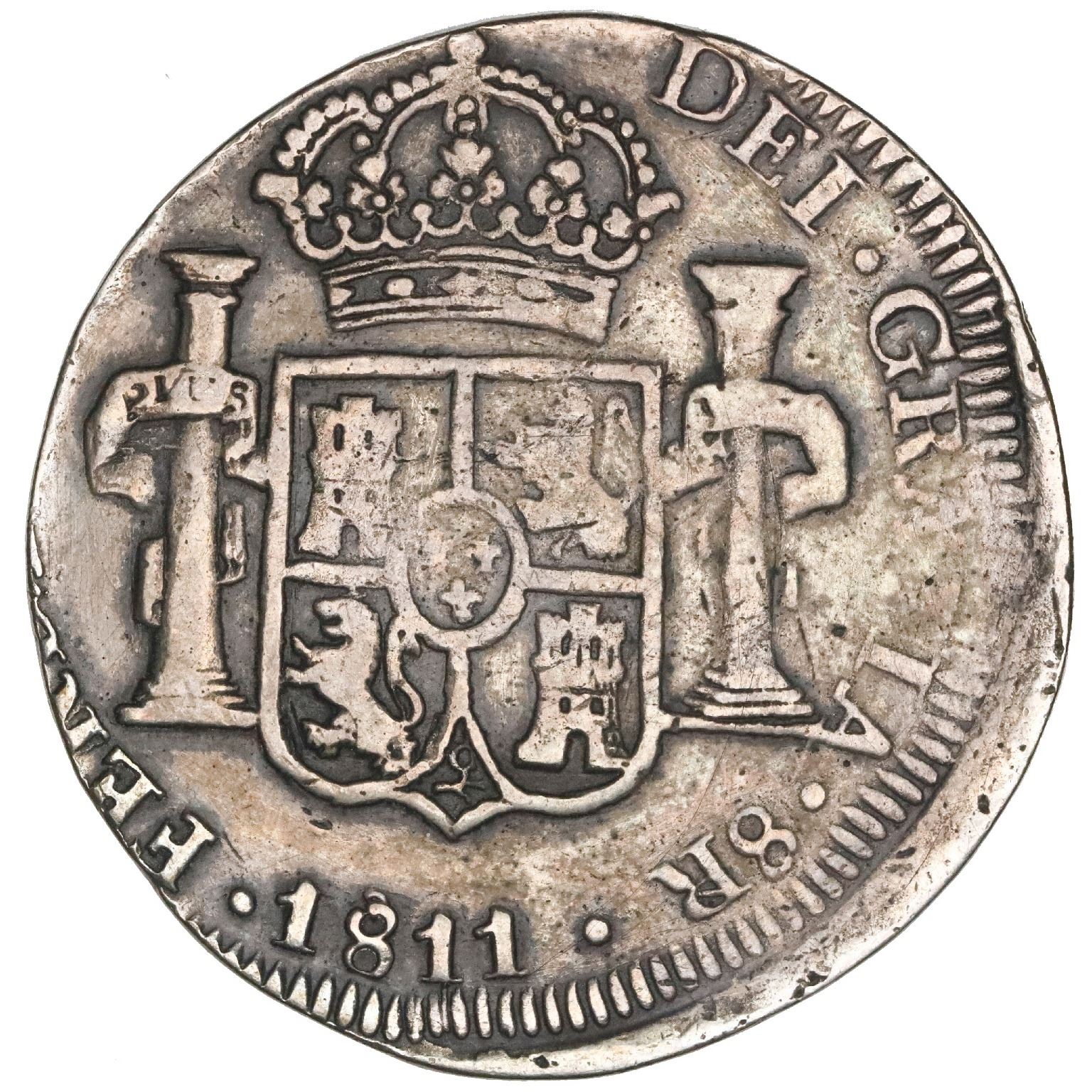WITHDRAWN: Zacatecas, Mexico, 8 reales provisional, 1811-LVO, NGC VF details / tooled. Cal-1445; KM-189. Crudely struck (typical) with off center reverse design, some areas of strike weakness but other details quite bold, some marks around the legends.