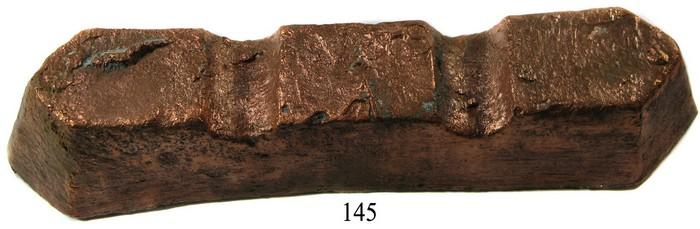Well-molded copper ingot from the Benamain (1890). 14.5 lb av, 11½" x 2¾" x 2½". Purposely-formed ingot with pointed-rectangular top and cylindrical cross-holes in the bottom, marked on the bottom with incuse "V&S" (Vivian and Son) above "A" (unknown), bright copper color all over with spots of green and white encrustation, similar to one in our Treasure Auction #4 that sold for $632.50. From the Benamain (1890), with certificate from the salvagers.