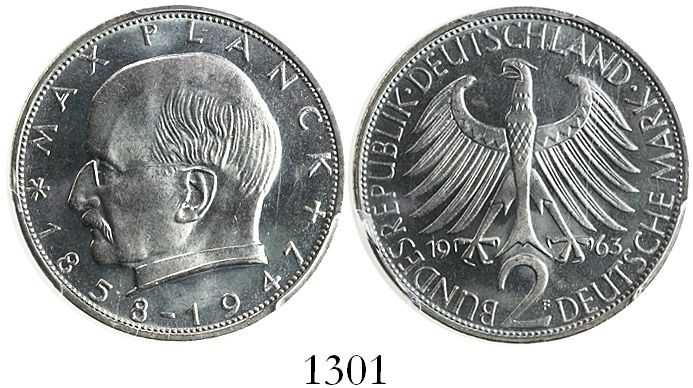 West Germany (German States), copper-nickel 2 mark, 1963-F (Stuttgart mint), encapsulated PCGS MS66+. KM-116. Nice luster, no toning, totally devoid of marks or wear.