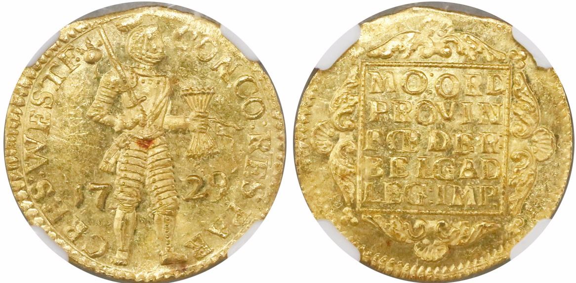 Westfriesland, United Netherlands, gold ducat, 1729, encapsulated NGC MS 63.