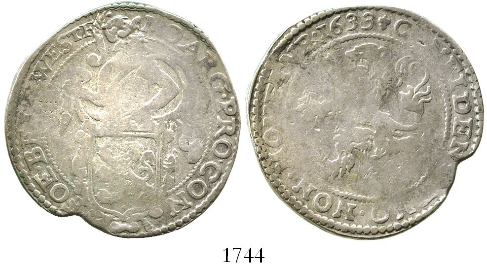 Westfriesland, United Netherlands, "lion" daalder, 1633. 26.8 grams. Weak centers but full legends, Fine with faint luster, typical edge-flaw.