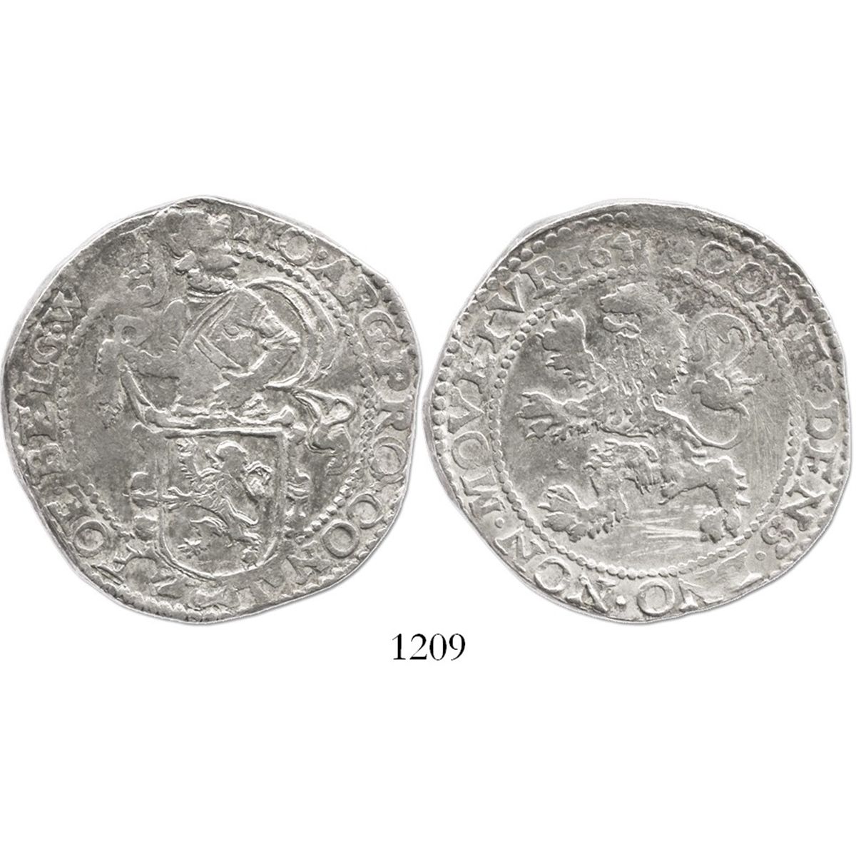 Westfriesland, United Netherlands, "lion" daalder, 164(?). KM-14.2. 27.3 grams. Lustrous VF with scratches in fields, small natural void on last digit of date, traces of rainbow toning at rims.