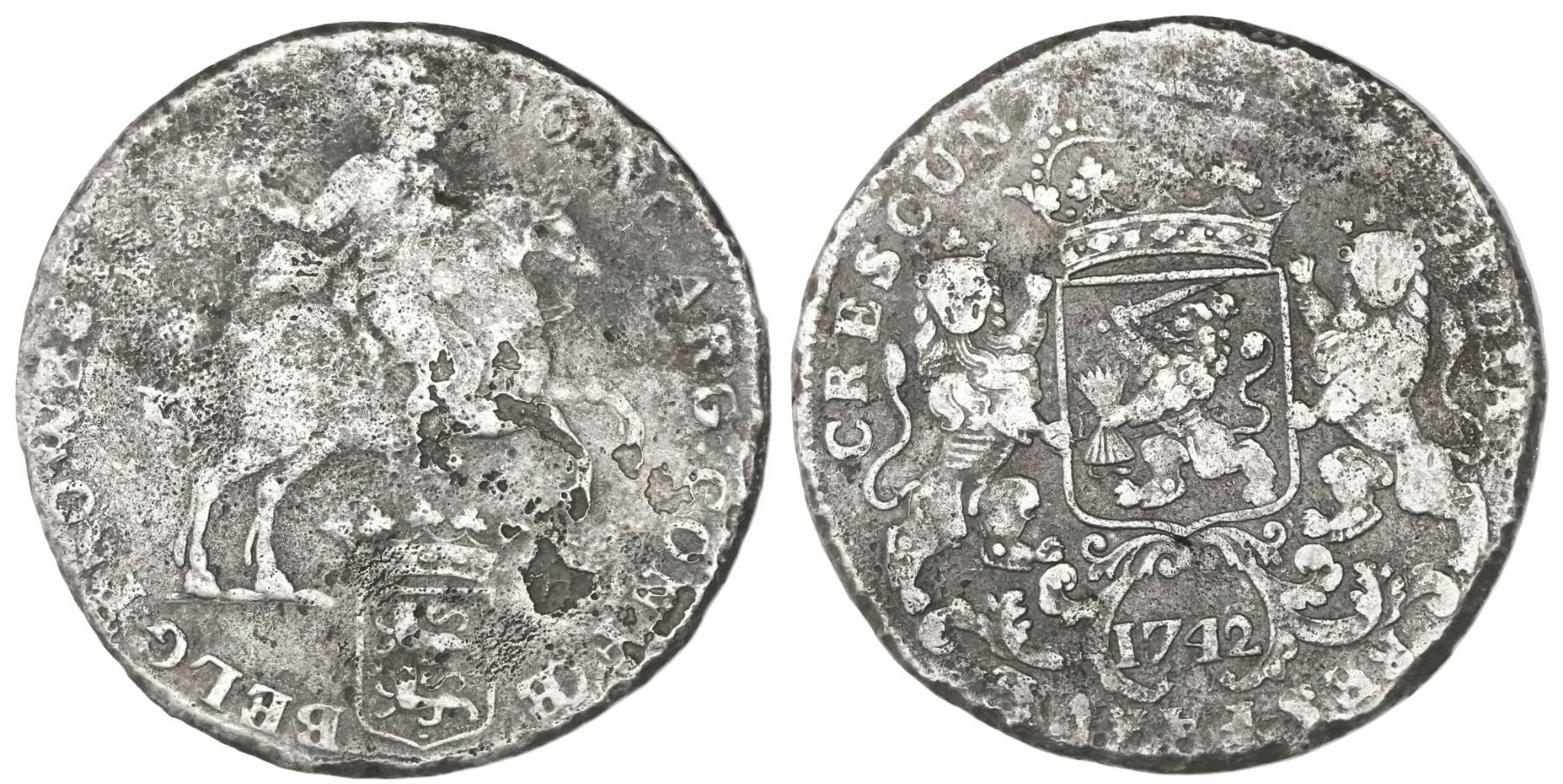 Westfriesland, United Netherlands, "rider" ducatoon, 1742. KM-127.1. 28.73 grams. Good details (VF) with contrasting toning but moderate surface corrosion all over. Recovered from: Hollandia, sunk in 1743 off the Isles of Scilly, southwest of England