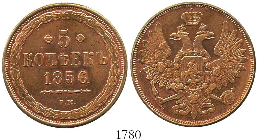 (Withdrawn) Russia, copper 5 kopeks, 1856-EM. KM-C152.1. 25.3 grams. Mint State with original luster and color, impressively flashy.