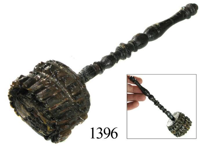 Wooden cocoa frother. 75.5 grams, 7" tall and 2-1/8" in diameter. This remarkably intact wooden object was used in the 1700s to stir chocolate and consists of a long, ornate handle that is removable from a heavy, round, knobby, mallet-like agitator, its old wood surfaces dark and lustrous, with tiny wormholes and chips here and there but fundamentally whole, a great display item that sat on display in Art's Museum for many years but was never for sale. From the Capitana El Rubí and pedigreed to Art McKee's Sunken Treasure Museum, with certificate.