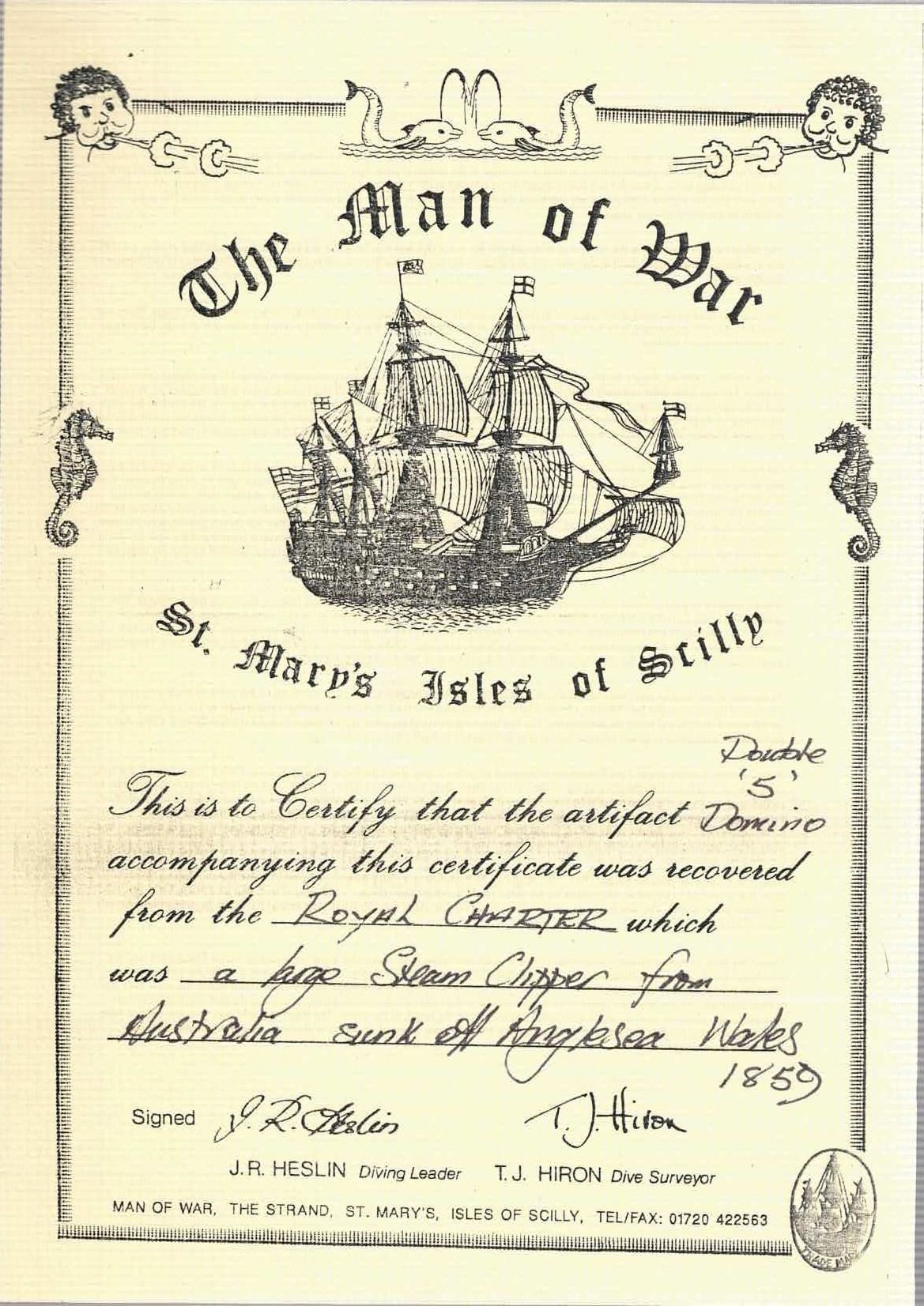 Wooden domino (five | five), ex-Royal Charter (1859). 9 grams. 1½" x ¾" x 1/8". Typical rectangular-shaped piece with each end containing five spots (or pips or dots), reddish brown encrustation nestled inside, the ends separated by a dividing line. The back is plain wood, a light brown all over. The steamer Royal Charter, built in 1855, sank near Anglesey, Wales, during a storm on October 2, 1859, while finishing a voyage from Melbourne, Australia, to Liverpool, England. Many passengers were gold miners traveling with their cargo of gold coins and Australian gold nuggets. Of the nearly 470 passengers and crew, only 39 survived. From the Royal Charter (1859), with certificate from the salvors and book Life and Death on the 'Royal Charter', by Chris and Lesley Holden (2009).