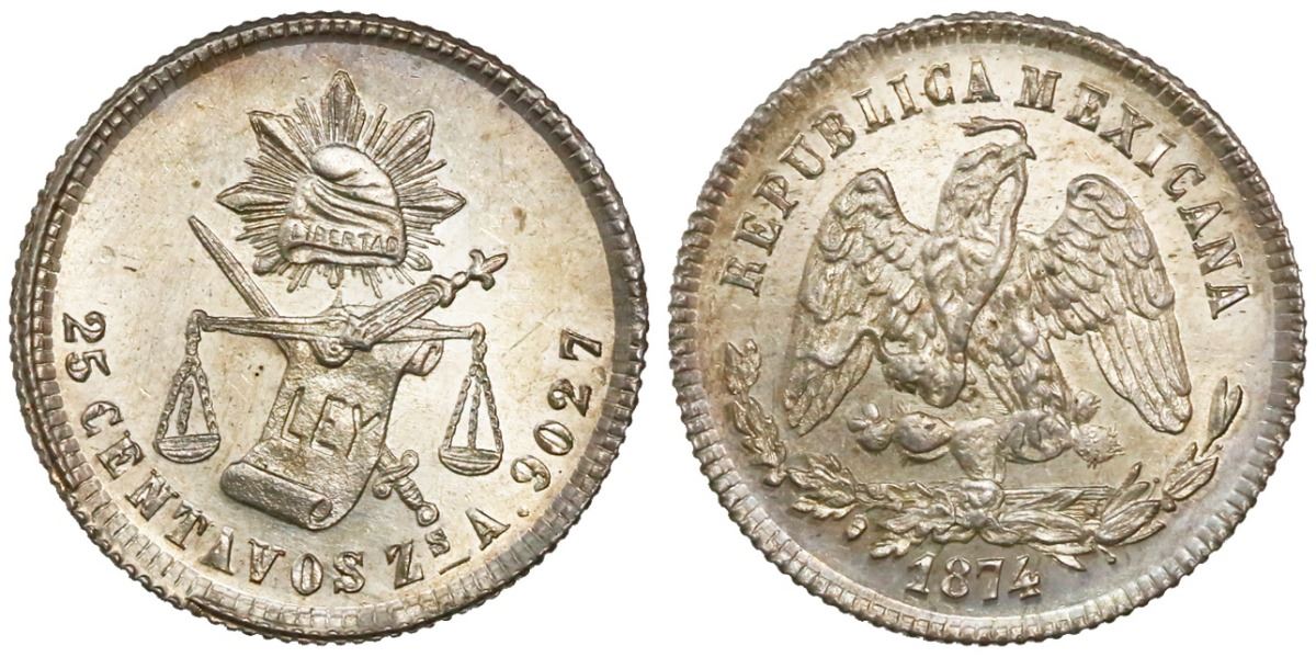 Zacatecas, Mexico, 25 centavos, 1874A.