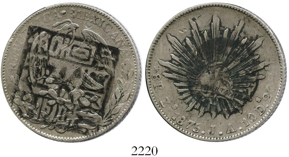 Zacatecas, Mexico, 8 reales, 1875JA, with chopmarks and inkstamp.