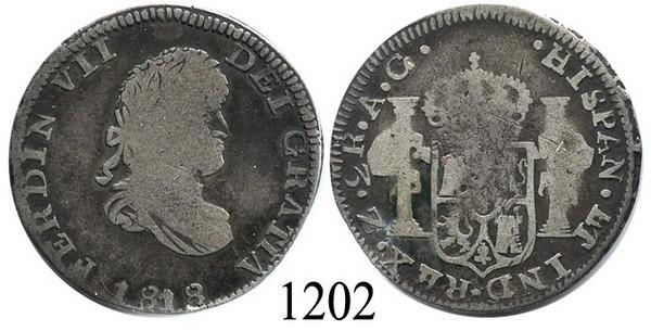 Zacatecas, Mexico (War for Independence), bust 2 reales, Ferdinand VII, 1818AG. KM-93.4. 5.9 grams. Fine for issue with very nice toning on fields, typically slightly crude.