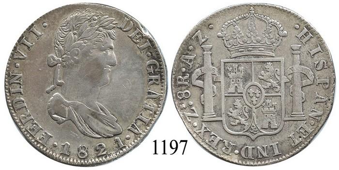 Zacatecas, Mexico (War for Independence), bust 8 reales, Ferdinand VII, 1821AZ, scarce. KM-111.5. 26.3 grams. Pedigreed to the Cayón auction of 13/XII/2001, lot #1637. Nicely toned VF with edge-bump, scarcer assayer for the date.