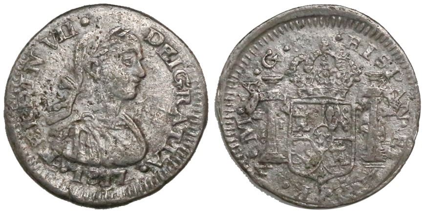 Zacatecas, Mexico, bust 1/2 real, Ferdinand VII, 1817AG. CT-1249; KM-73.1. 1.9 grams. Non-toned XF with moderate porosity, slightly off-center reverse.