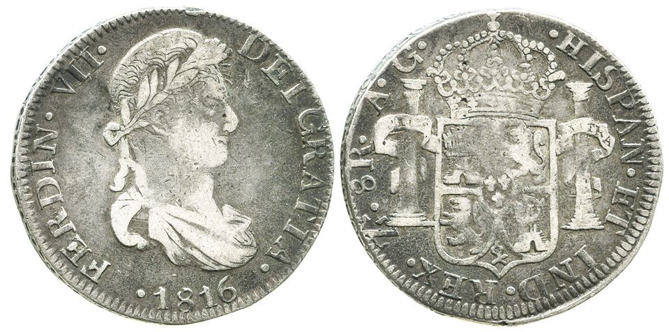 Zacatecas, Mexico, bust 8 reales, Ferdinand VII, 1816AG. KM-111.5; CT-687. 26.1 grams. Deeply toned VF+, slightly off-center reverse.