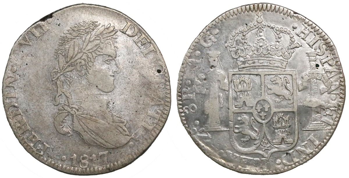 Zacatecas, Mexico, bust 8 reales, Ferdinand VII, 1817AG. Calbeto-1773; CT-688; KM-111.5. 25.7 grams. Well-struck XF for the issue, with some luster and a large die break on reverse, no toning (lightly cleaned at some point).