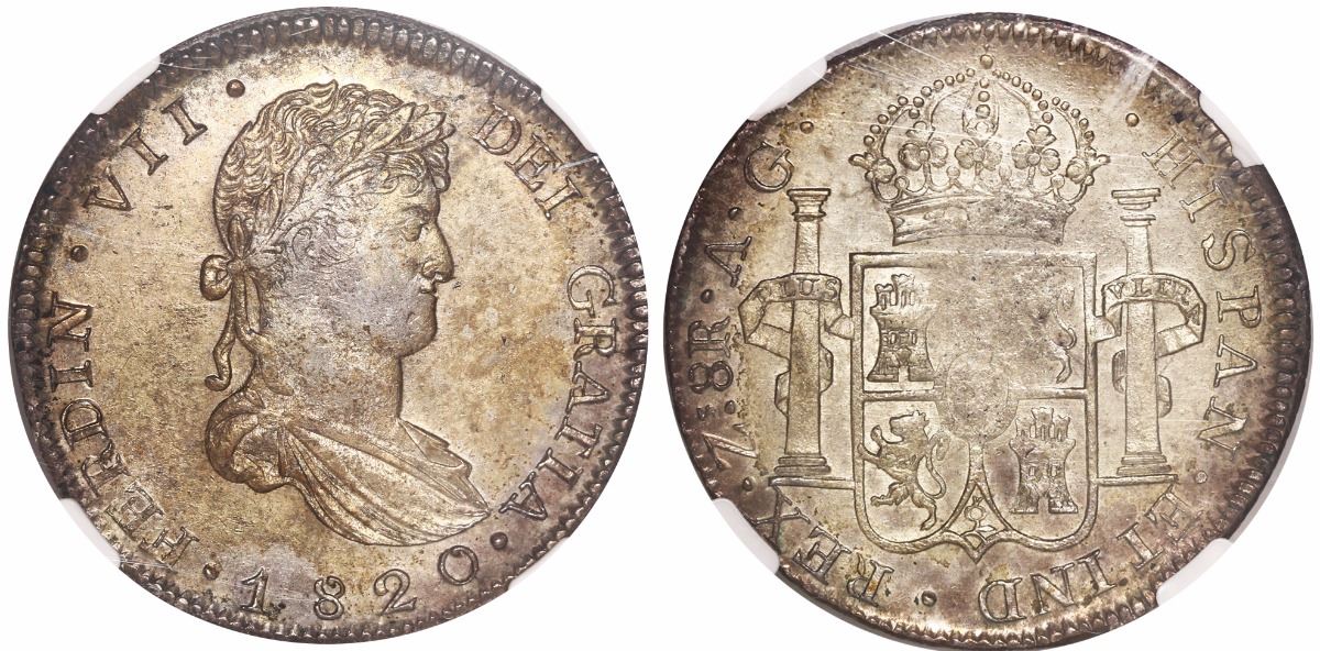 Zacatecas, Mexico, bust 8 reales, Ferdinand VII, 1820AG, encapsulated NGC AU 58. Golden toning all over with much underlying luster, weak centers as usual.
