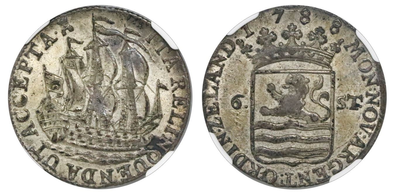 Zeeland, Netherlands, 6 stuivers, 1788, NGC MS 62, finest and only specimen in NGC census.