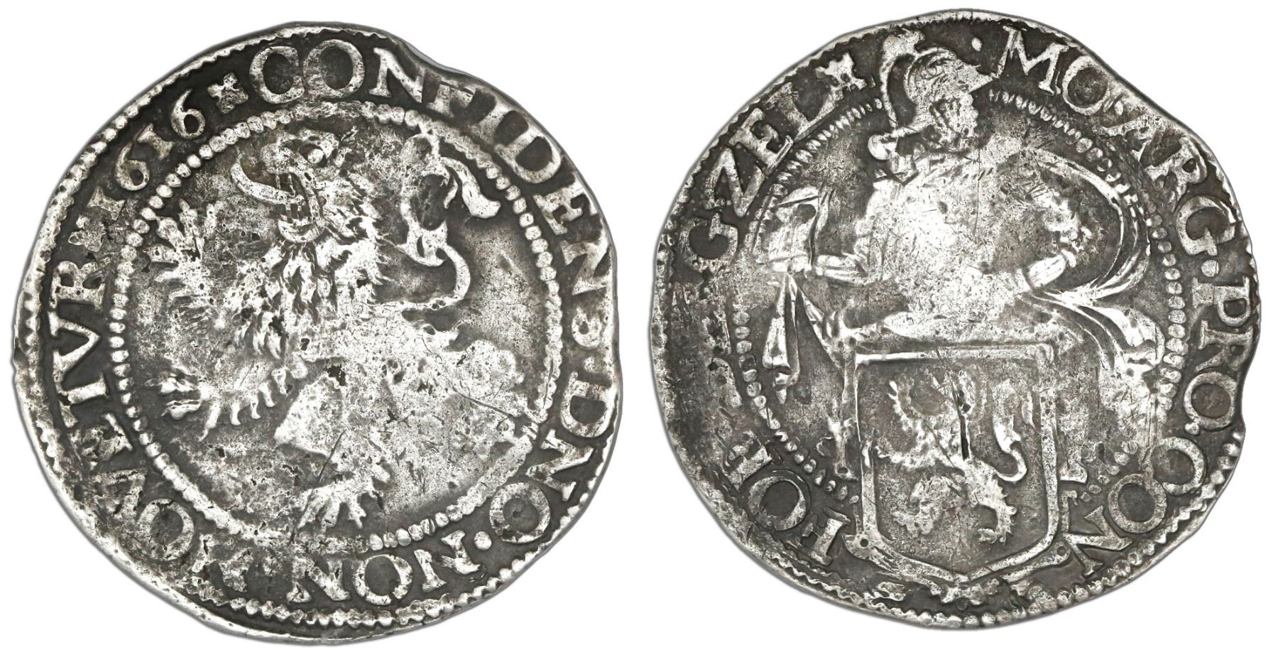 Zeeland, United Netherlands, "lion" daalder, 1616. KM-16. 22.58 grams. Choice full details on both sides with nicely contrasting toning, very light surface corrosion. Recovered from: Campen, sunk in 1627 off Isle of Wight, south of England